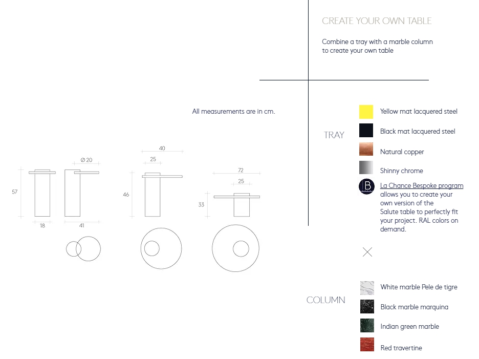 一如La Chance擅長的多元材質混合風格,Salute以藝術的形式混合大理石與金屬結構,線條簡約又有著鮮明個性,展露了高度的視覺衝擊力。作為一個邊几,Salute成為了我們家中扶手椅或舒適沙發旁邊的良伴,多款的配色與組合讓你可自定義和適應尺寸與顏色。