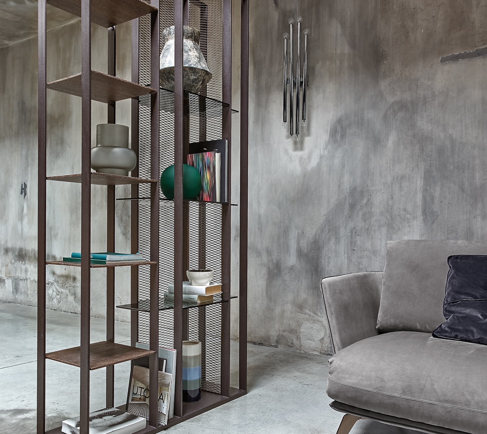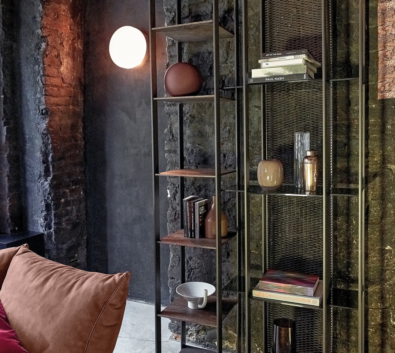 簡約金屬壁櫃,以雲母棕色搭配煙燻玻璃與木材,呈現沉穩內斂的都會個性。