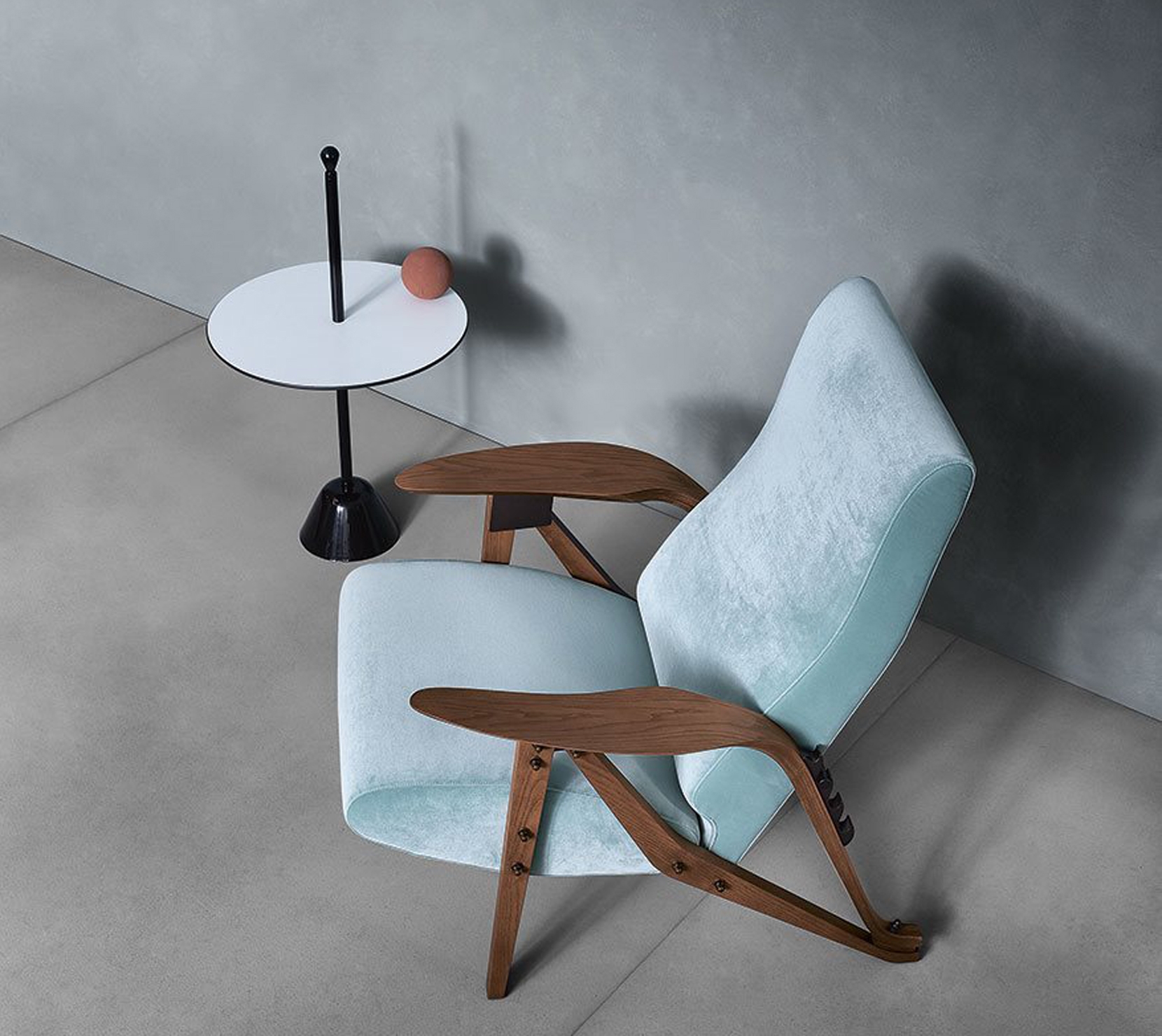 Gilda 將彎曲的雕塑結構與兩個填充元素(座椅和背靠)結合在一起,特殊的線條設計透露出 Carlo Mollino 的建築師背景,扶手與椅後腳一體成型製成,並與前腳相連,為扶手椅的輪廓增添了動感。