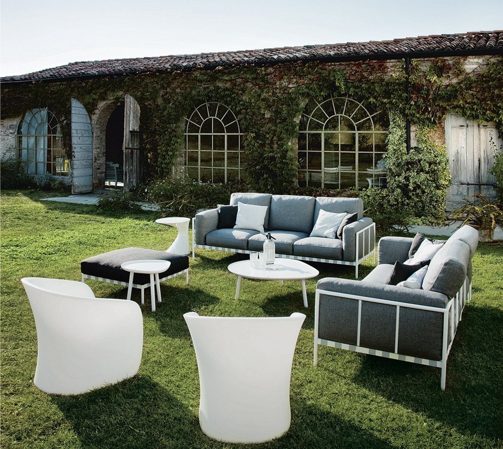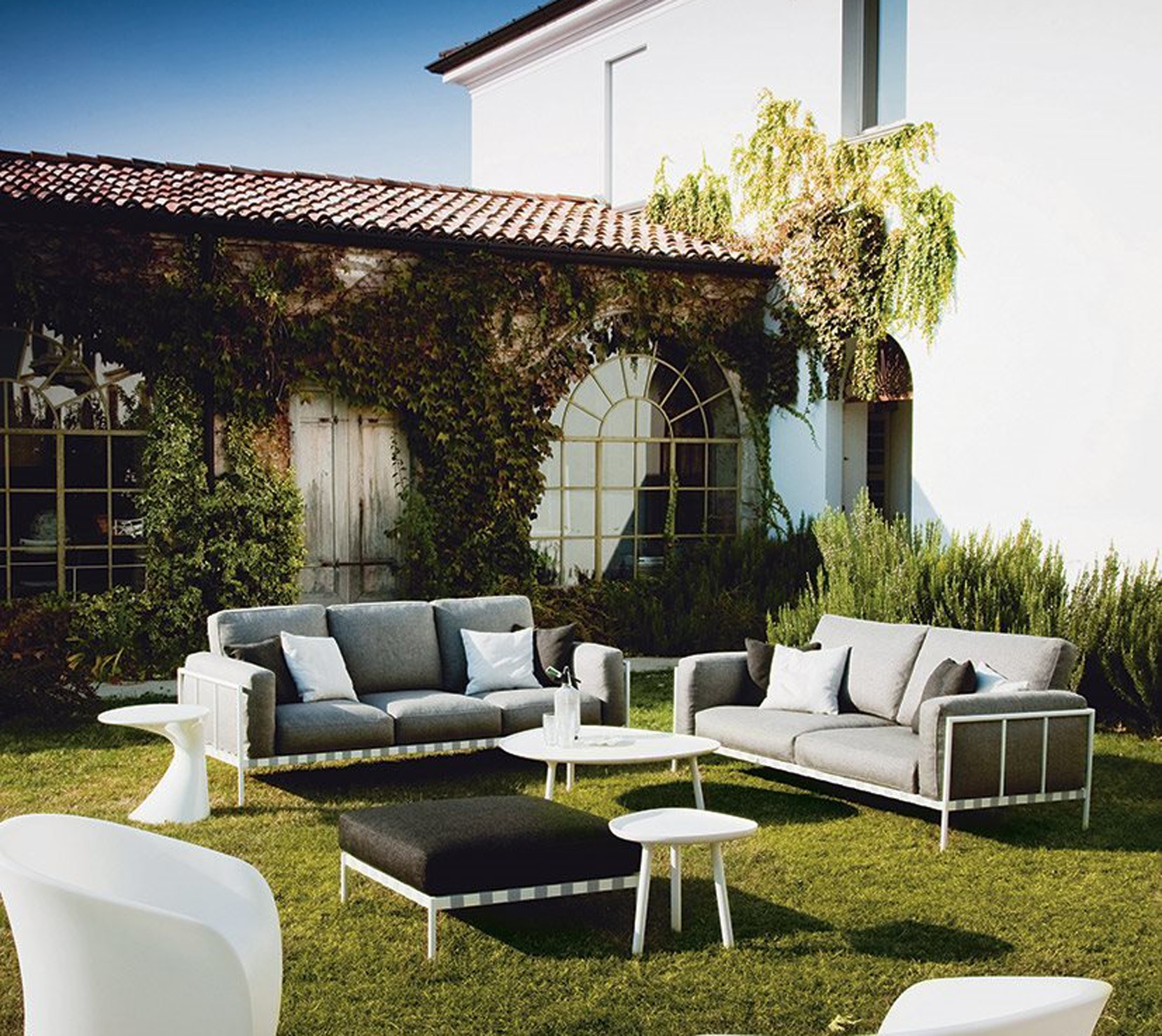 鋼架結構支撐,戶外使用,白漆和黑漆兩款。彈力條懸掛。坐墊、靠墊和扶手墊內芯填充開孔網狀聚醚/Paineira防水植物纖維。布料Talasso護套可拆卸。
