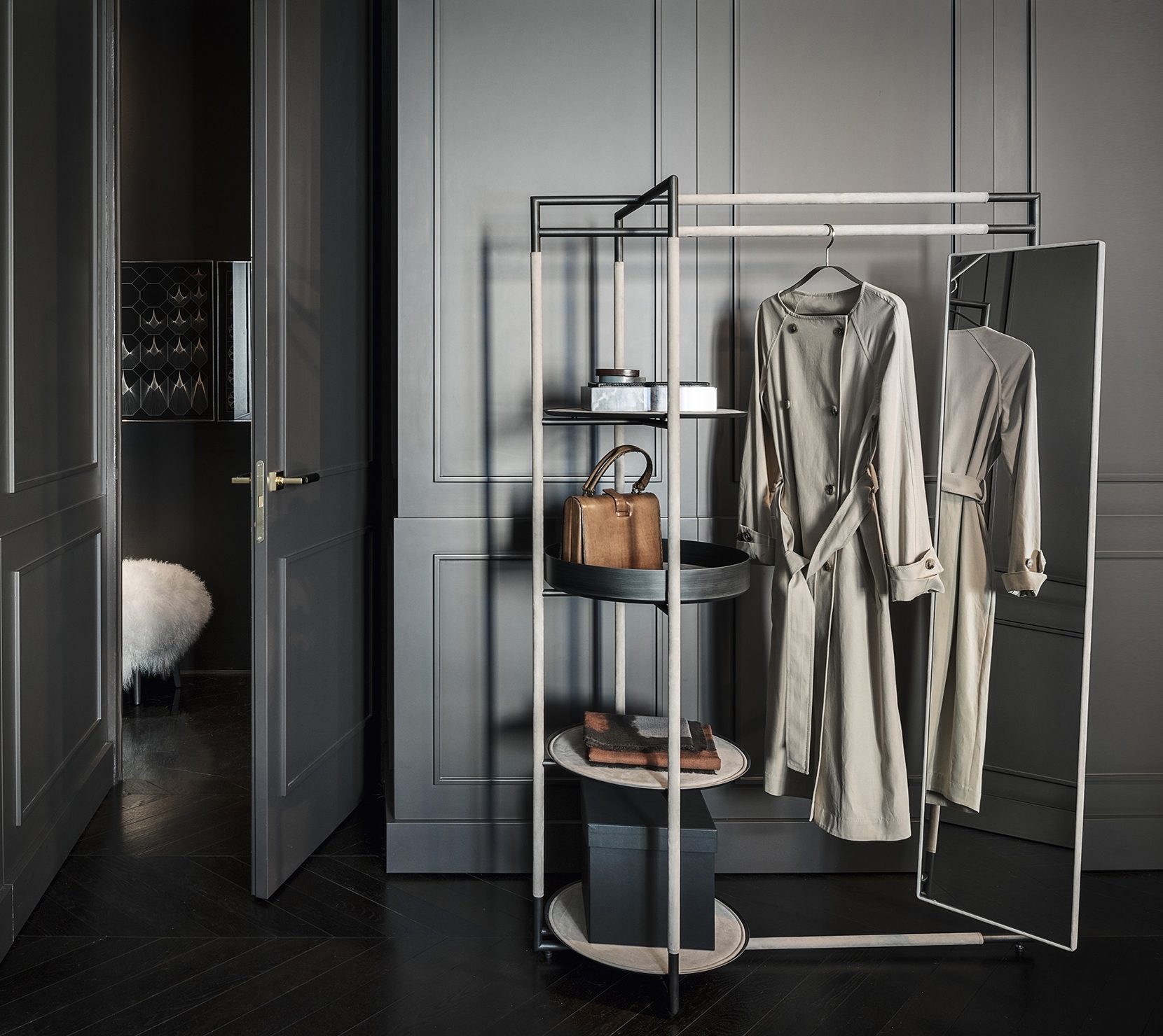 Bak Valet Stand Mirror 保有 Bak 系列的設計,並在此版本中增加了一個鏡子。