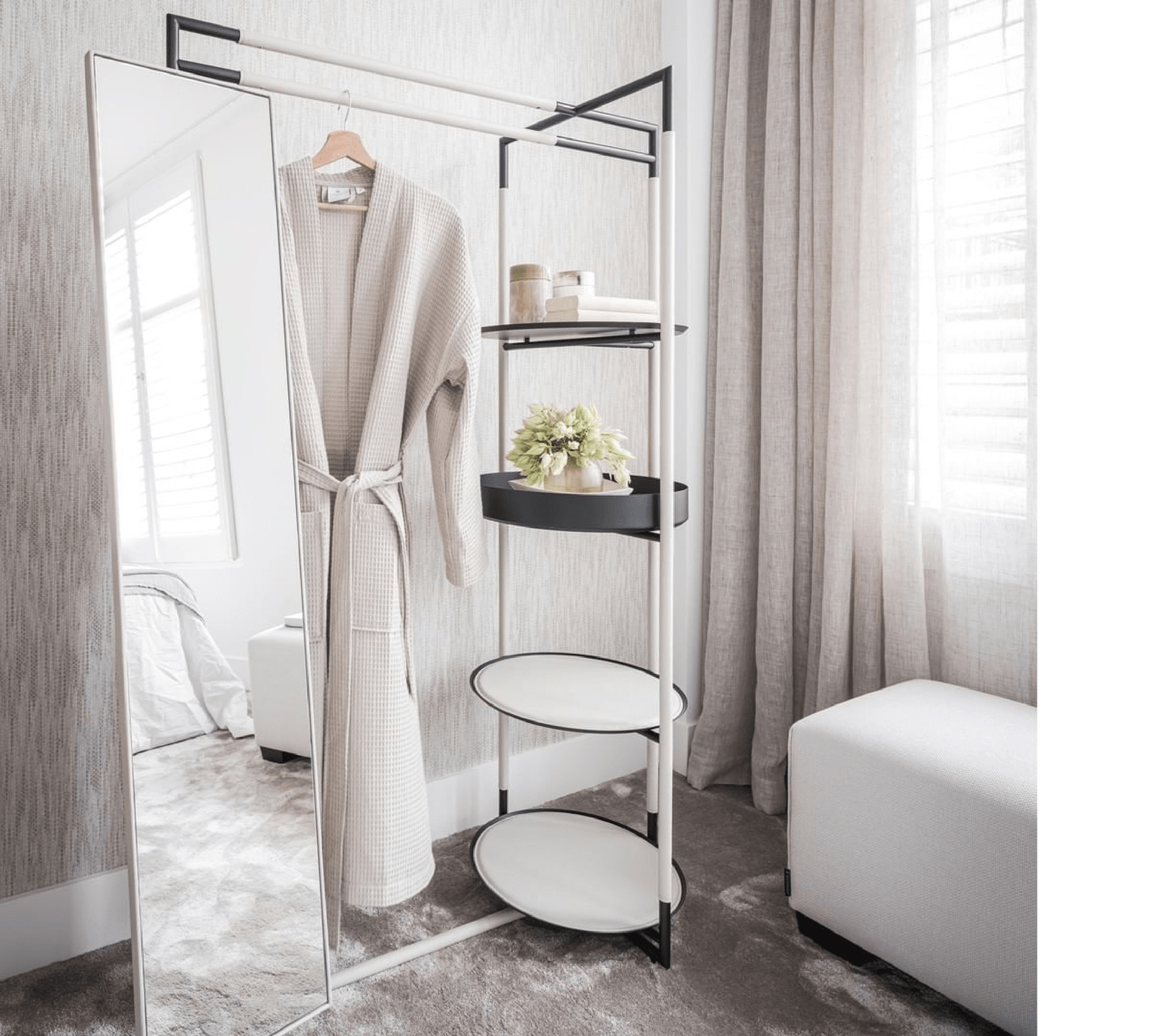 Bak Valet Stand Mirror 衣帽架可用於懸掛衣服,而側面帶有皮革覆蓋的底座可以用作零錢和其他物品的存儲空間,發揮最大的功能性。