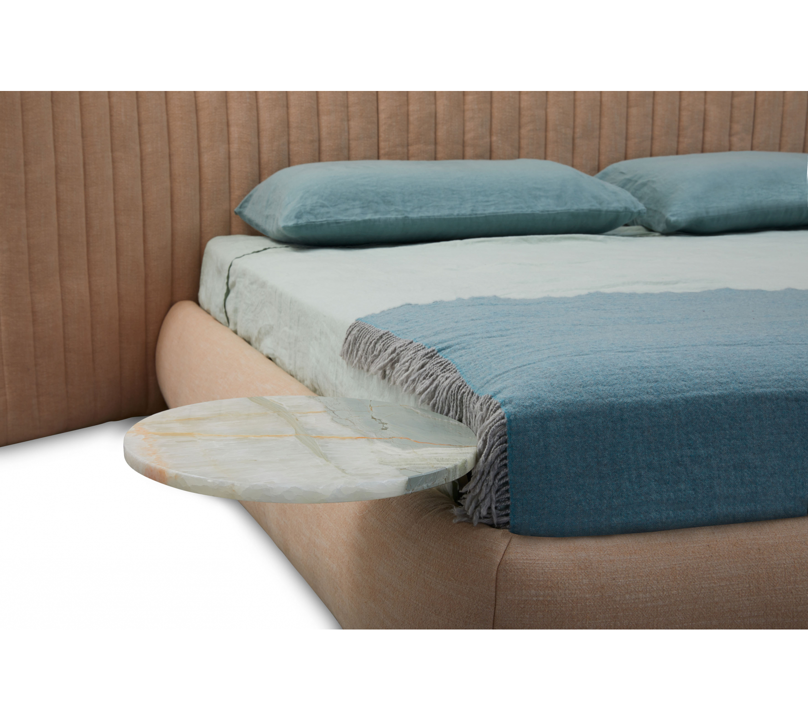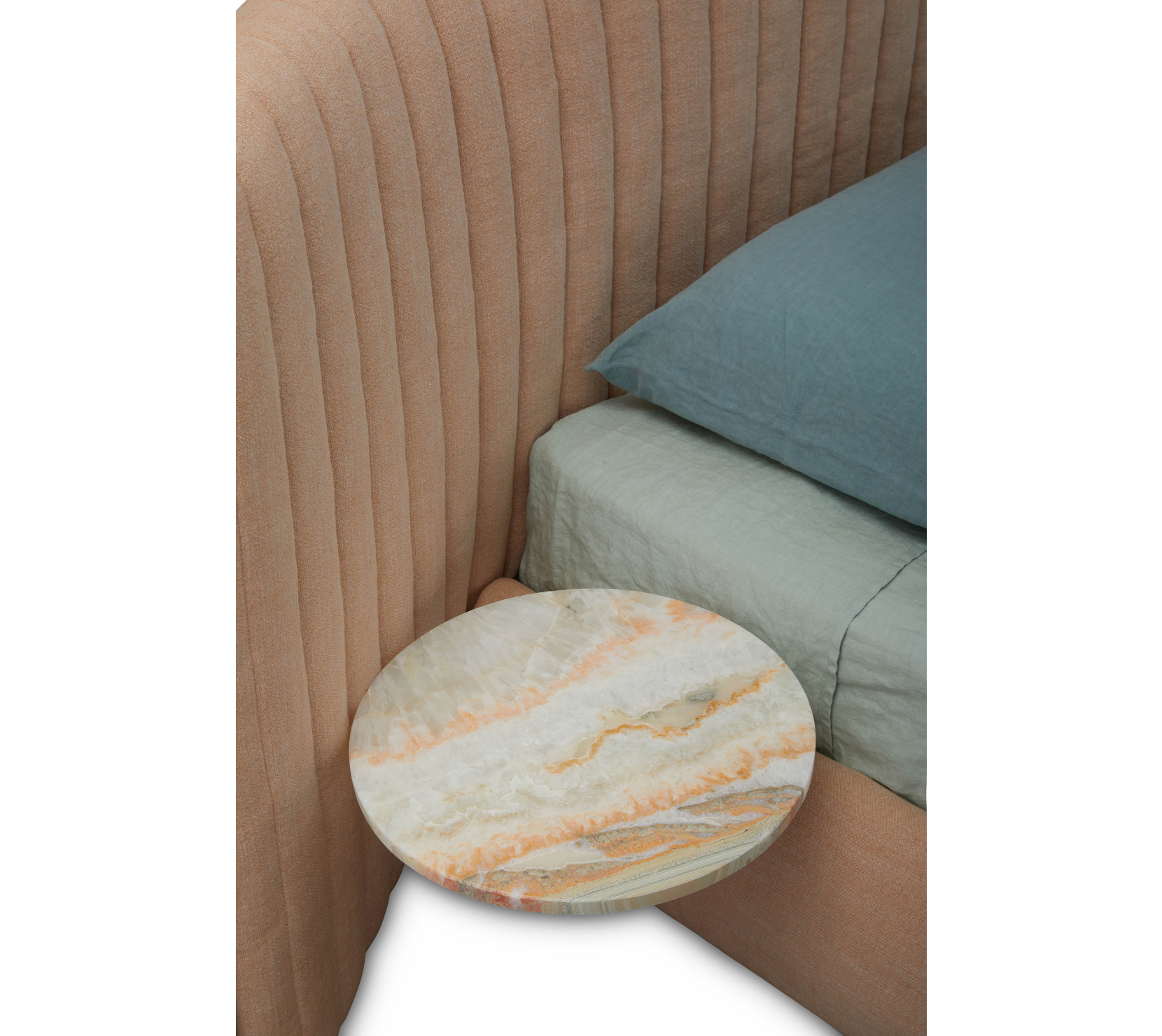搭配細緻縈繞的瑪瑙石面,化為可靈活配置的床邊平台,在機能與質地之間延展空間的使用方式,也呼應整體設計的自由與秩序並存。