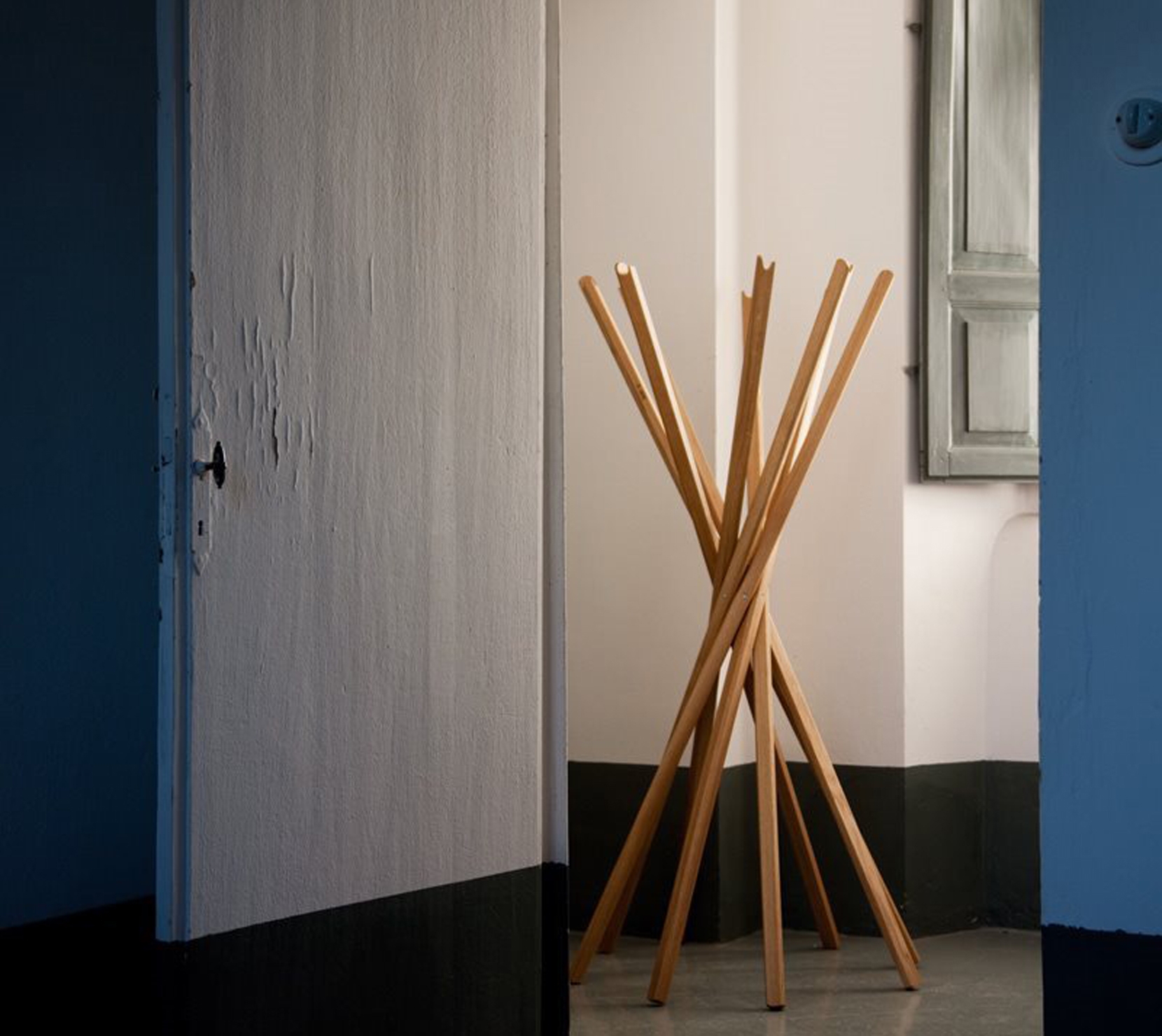Sciangai 衣帽架以傳統中國遊戲為設計靈感,木棒握在手中,然後散落在檯面上。