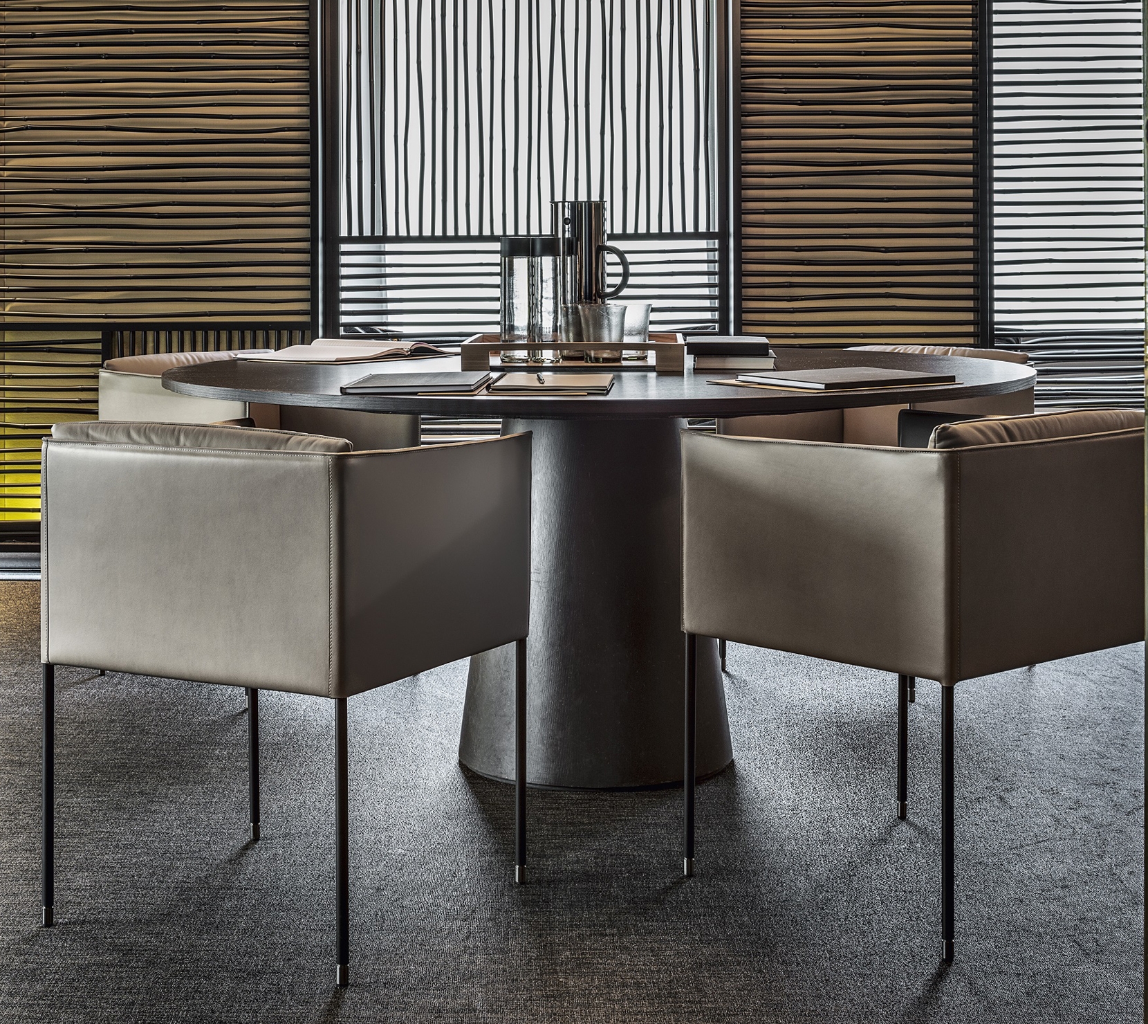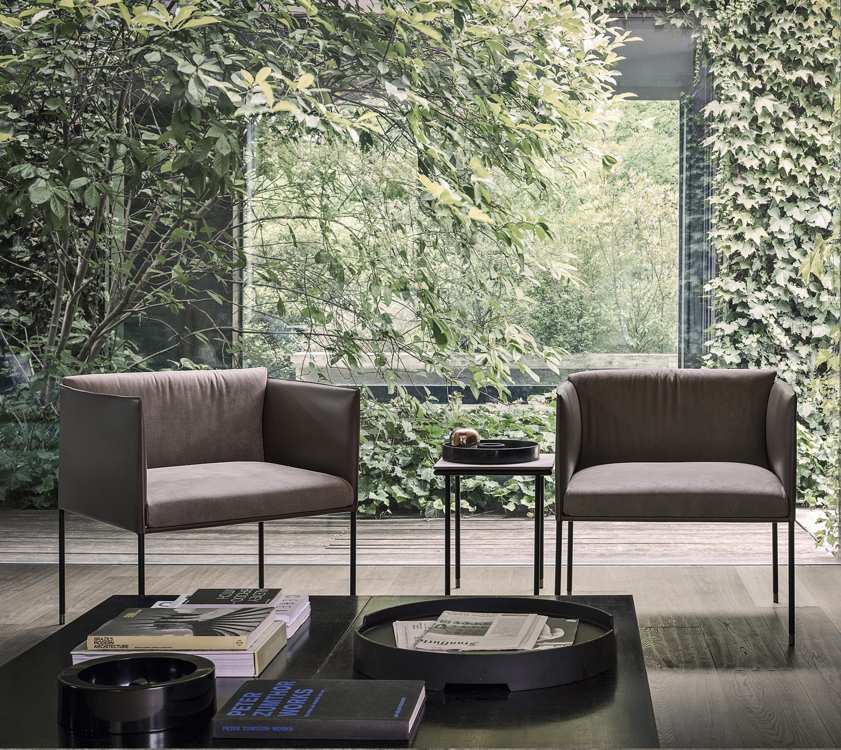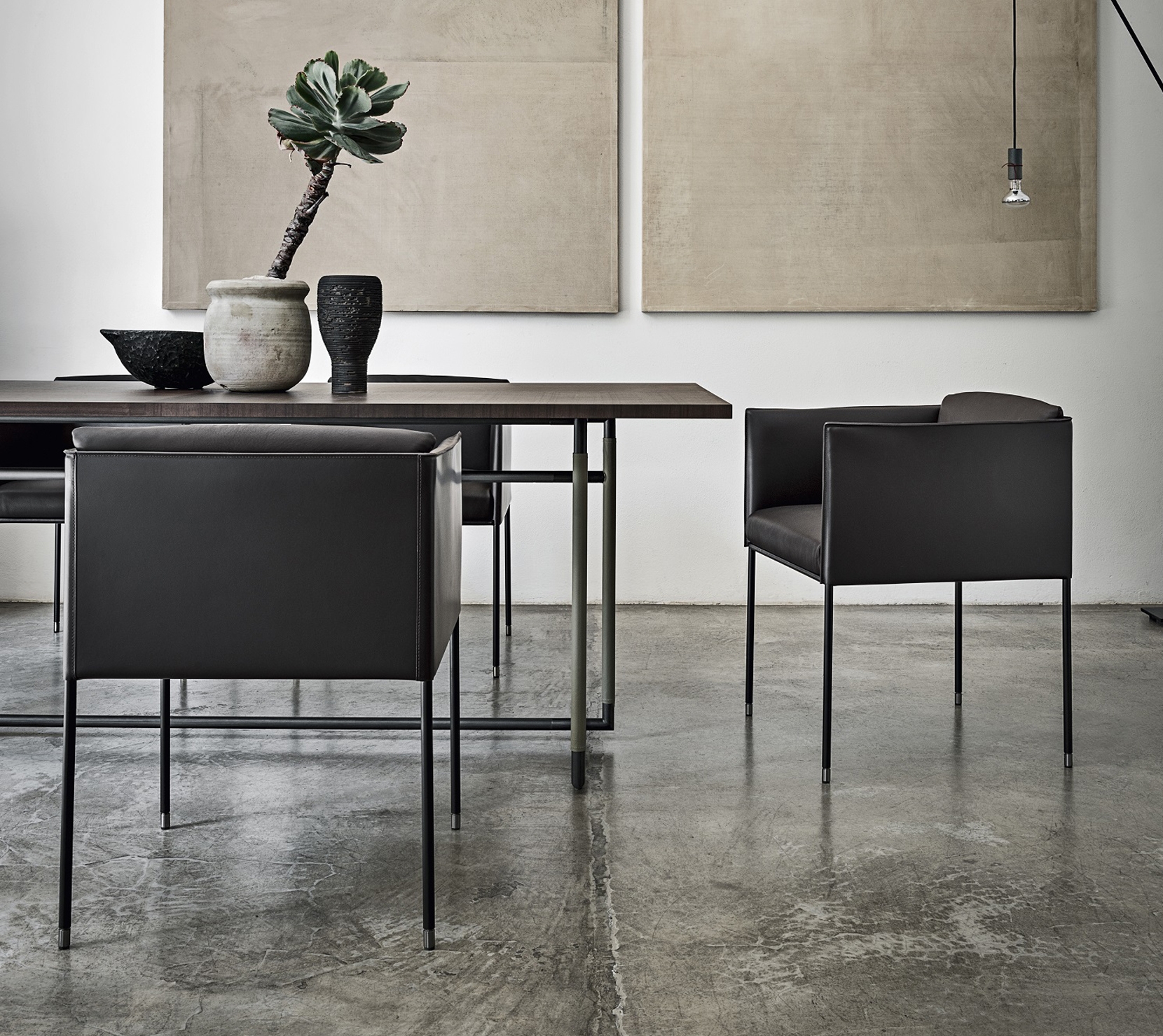 SQUARE L扶手椅系列採用輕薄襯墊外型設計,簡約素雅,以皮革或馬鞍皮革裝飾椅身,搭配深色漆面鋼管椅腳,透過纖細優雅的設計形式,塑造出輕盈之感,以輕巧的形式訴說異材質的沉穩與質感。