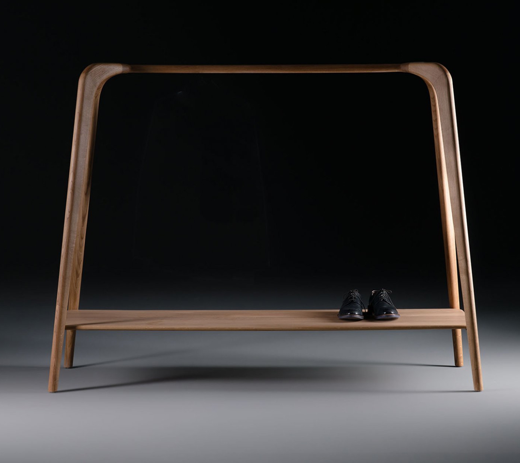 Swing Coat衣架以簡約歐風形式,體現溫馨現代居家感。 實木桌身,經工匠悉心打磨,融合線性與弧線美學,呈現出優雅簡潔的居家魅力,不僅上方可懸掛衣物,底下設有擱板支架,也可置放衣物鞋子,增添實用度。