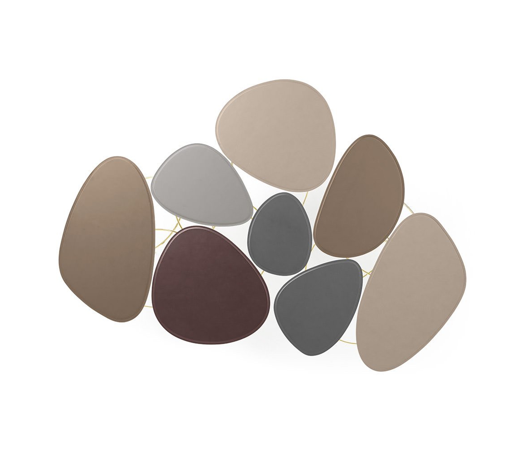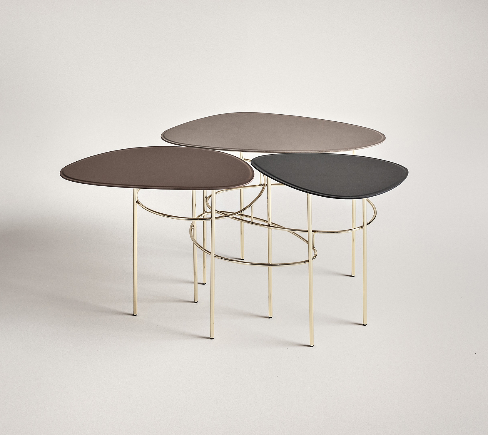 VIAE邊桌,以線性元素設計支架,金屬支架加強結構並採用拋光鍍鉻或黃銅飾面,呈現高雅美感,而桌面則以不規則形設計,大小不一卻又巧妙創造和諧視感,並完全採用馬鞍皮革裝飾。此系列邊桌分為三個與五個桌面的兩種款式,靈感來自古羅馬道路的鵝卵石,也因透過本身金色結構與馬鞍皮革的混搭,結合了魅力和創造力,更引人注目。