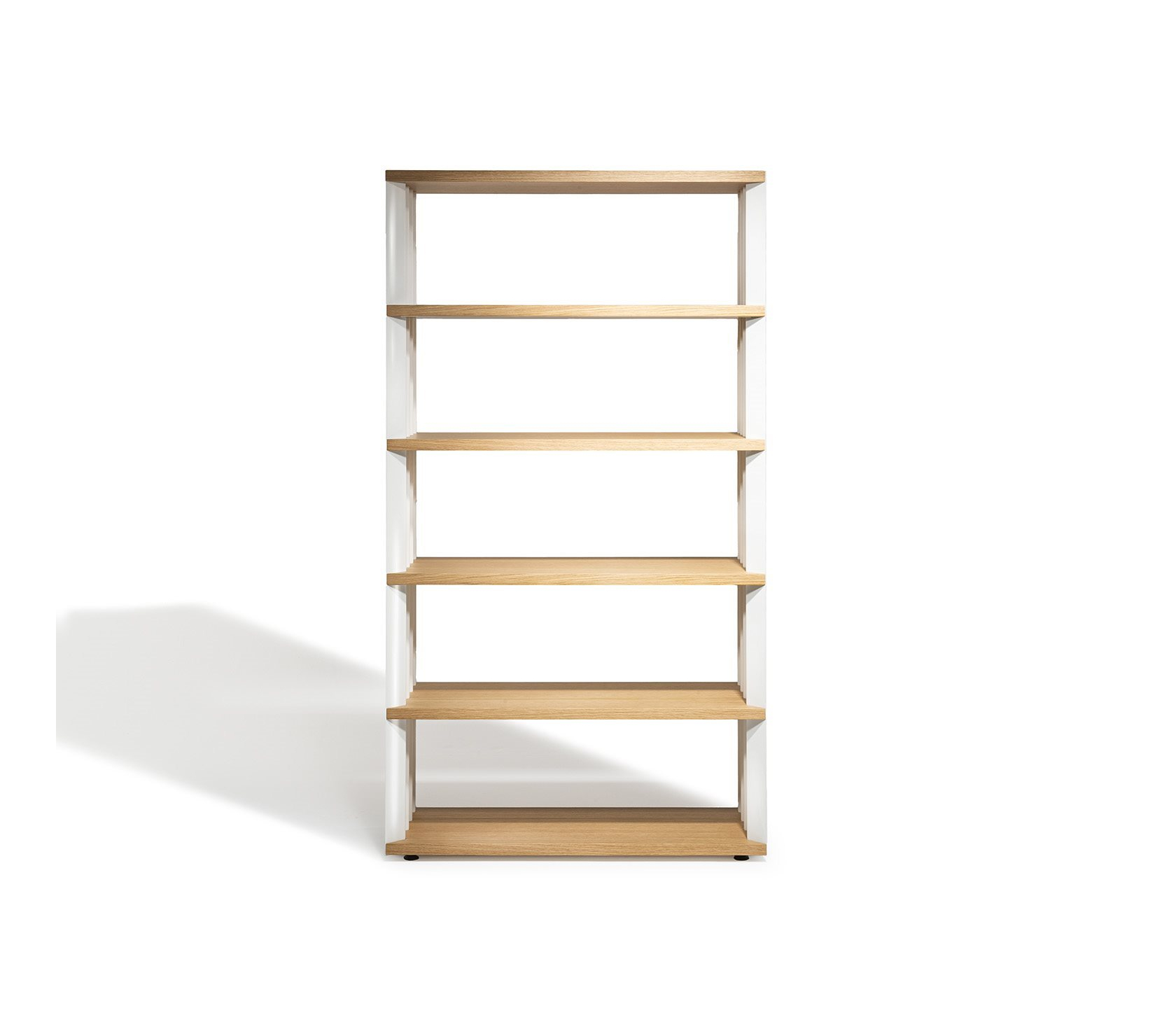 書櫃,結構為拋光塗裝鋼材,可選色包含 talc、caramel、orange、amaranth 與 algae。層板採用 MDF 覆天然橡木木皮,上透明保護漆。高版本可並排使用,另附連結件強化結構整合。