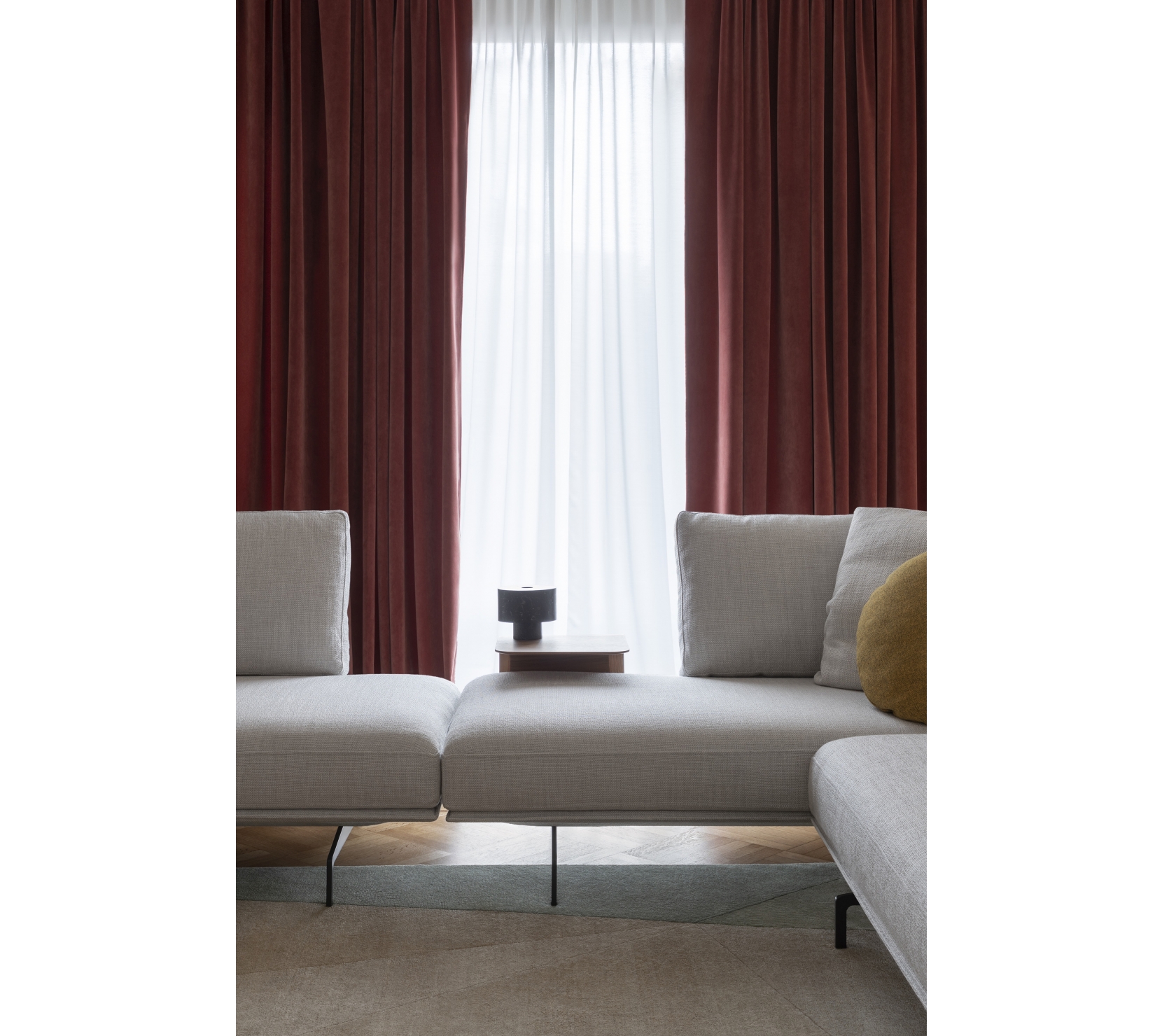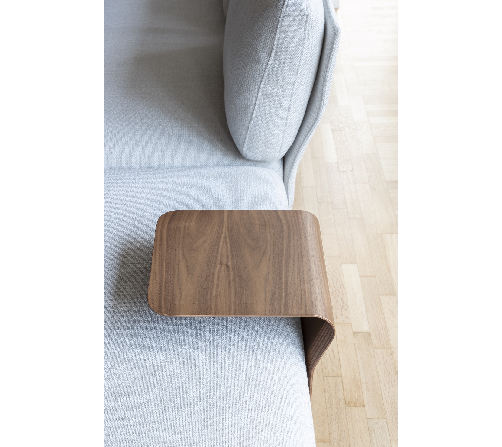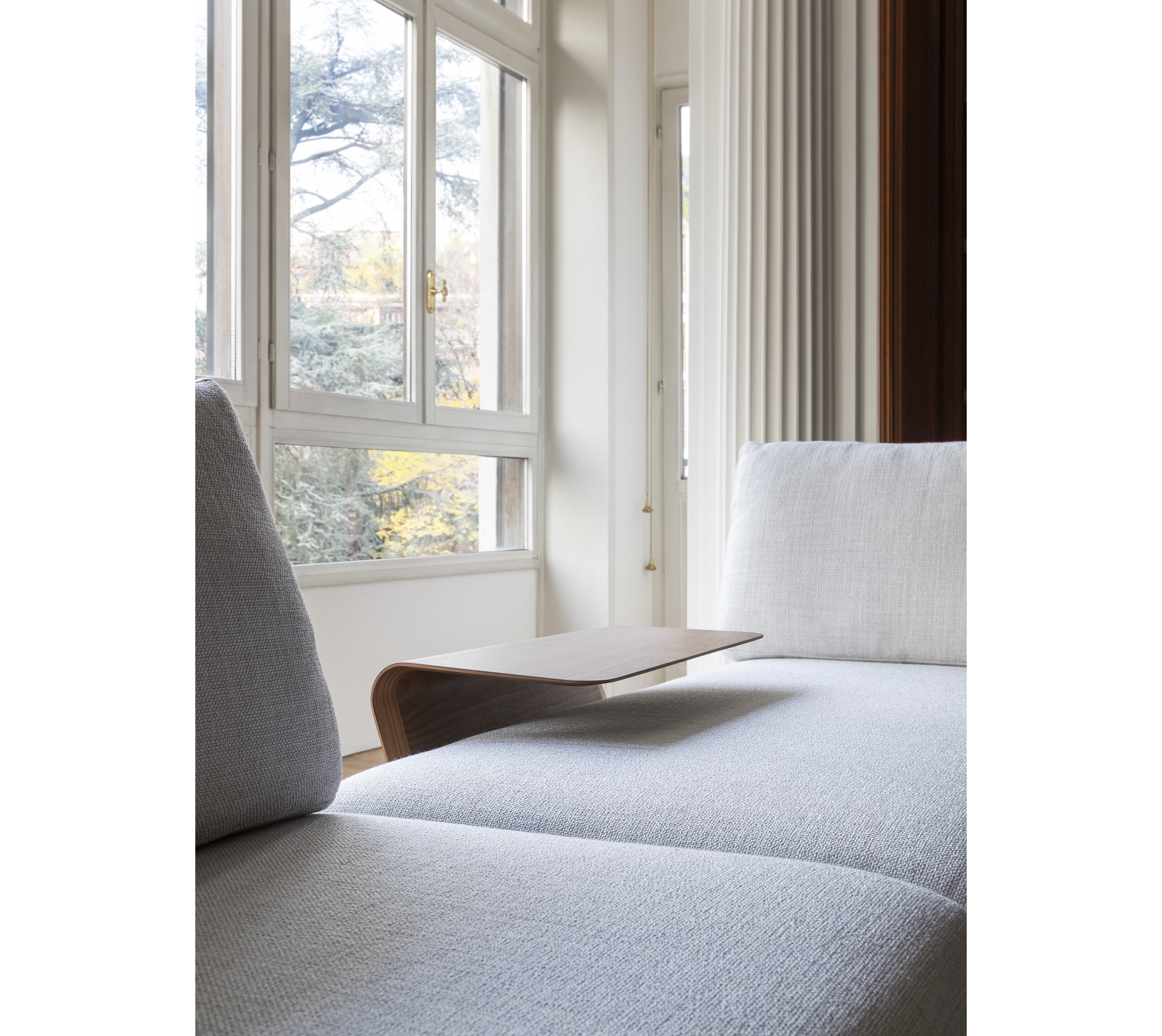 以優雅高貴、簡約柔和的設計風格,搭配木製邊几,表現出機能與美學兼具的特色。