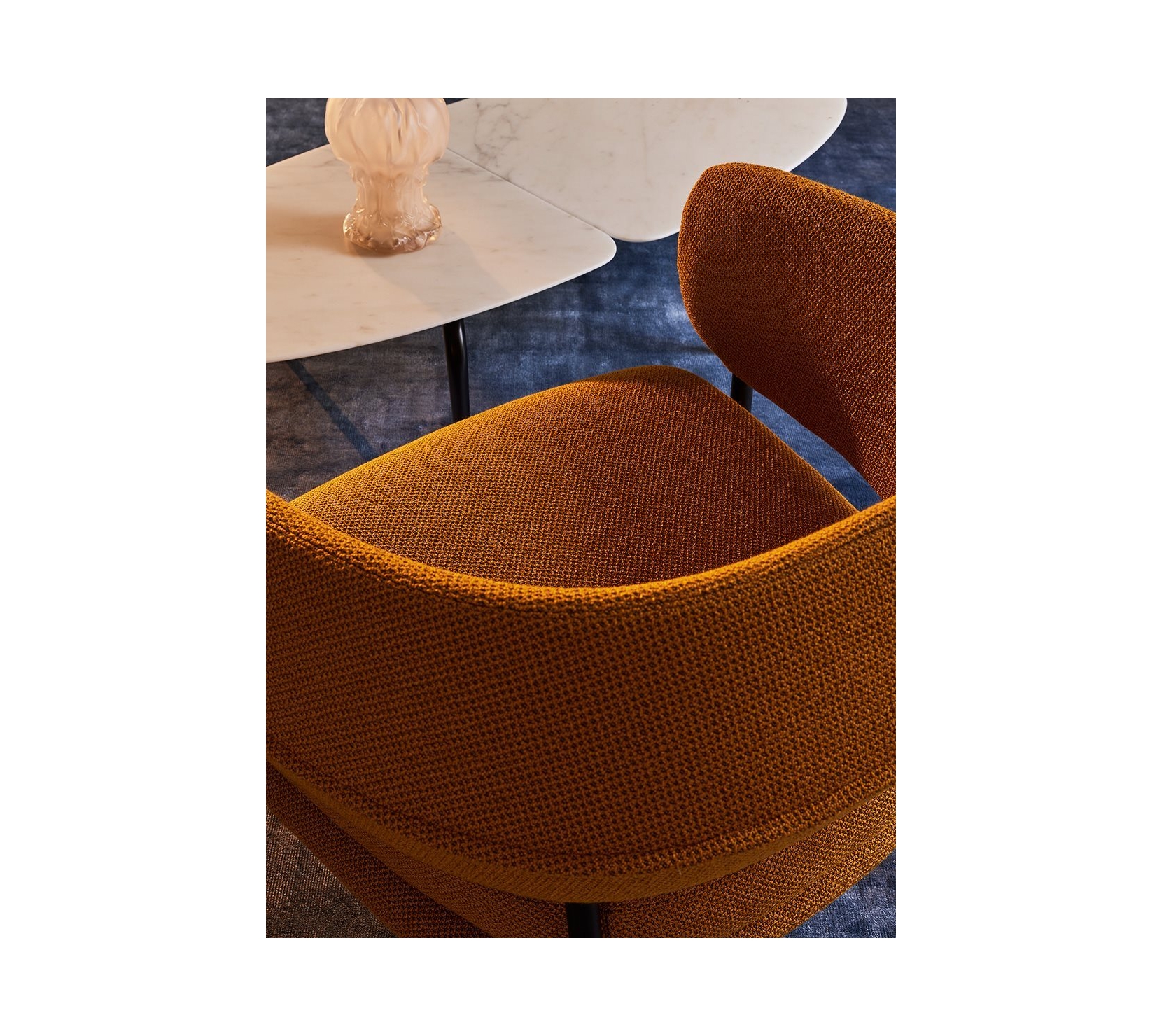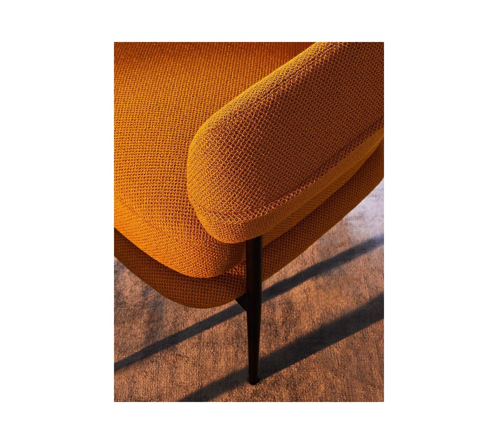 Nena Lounge 適用於住宅、商空、 餐飲、和飯店業等空間。 它擁有讓人印象深刻的外形——輕盈的框架結合厚重的座墊元素。