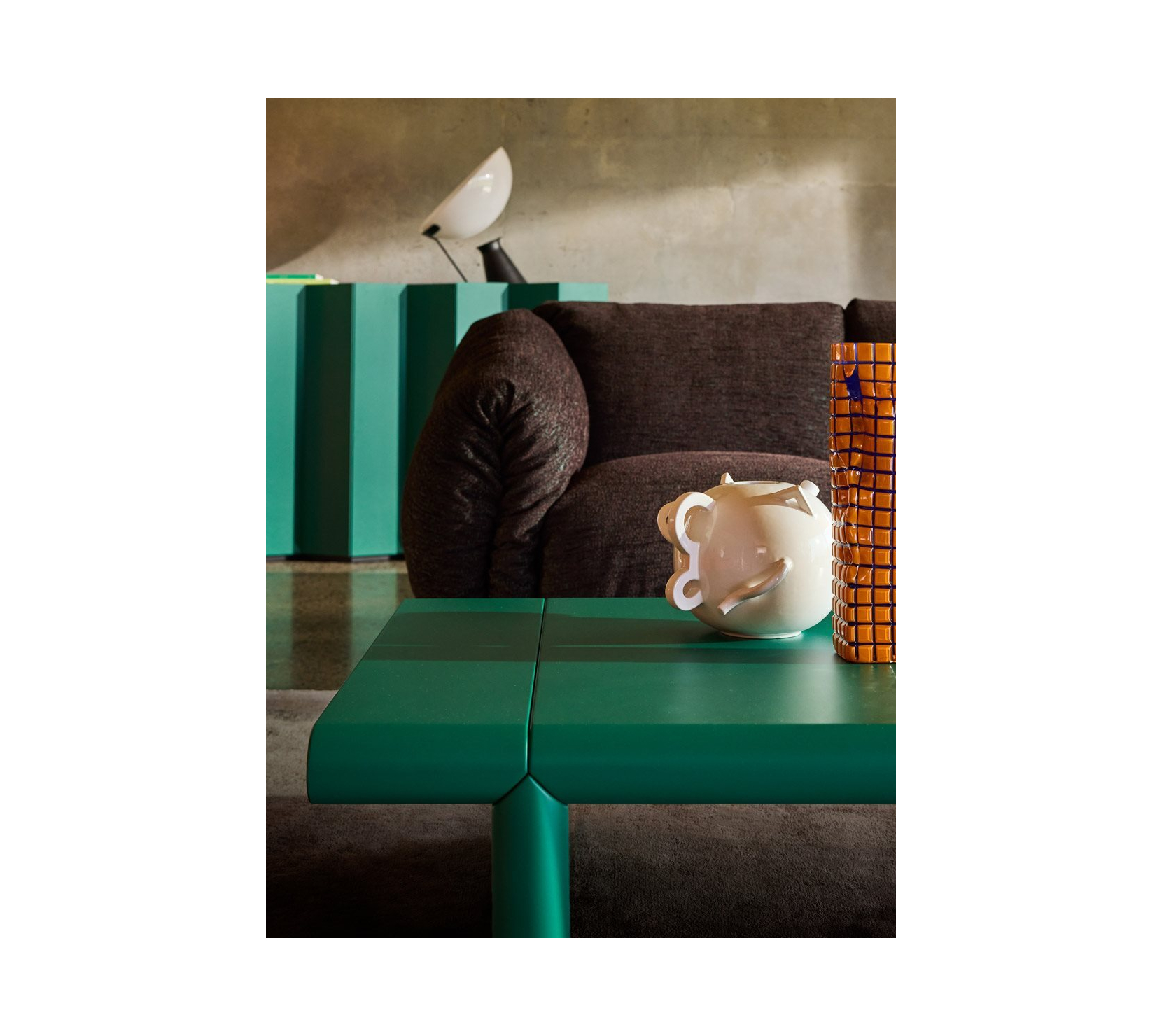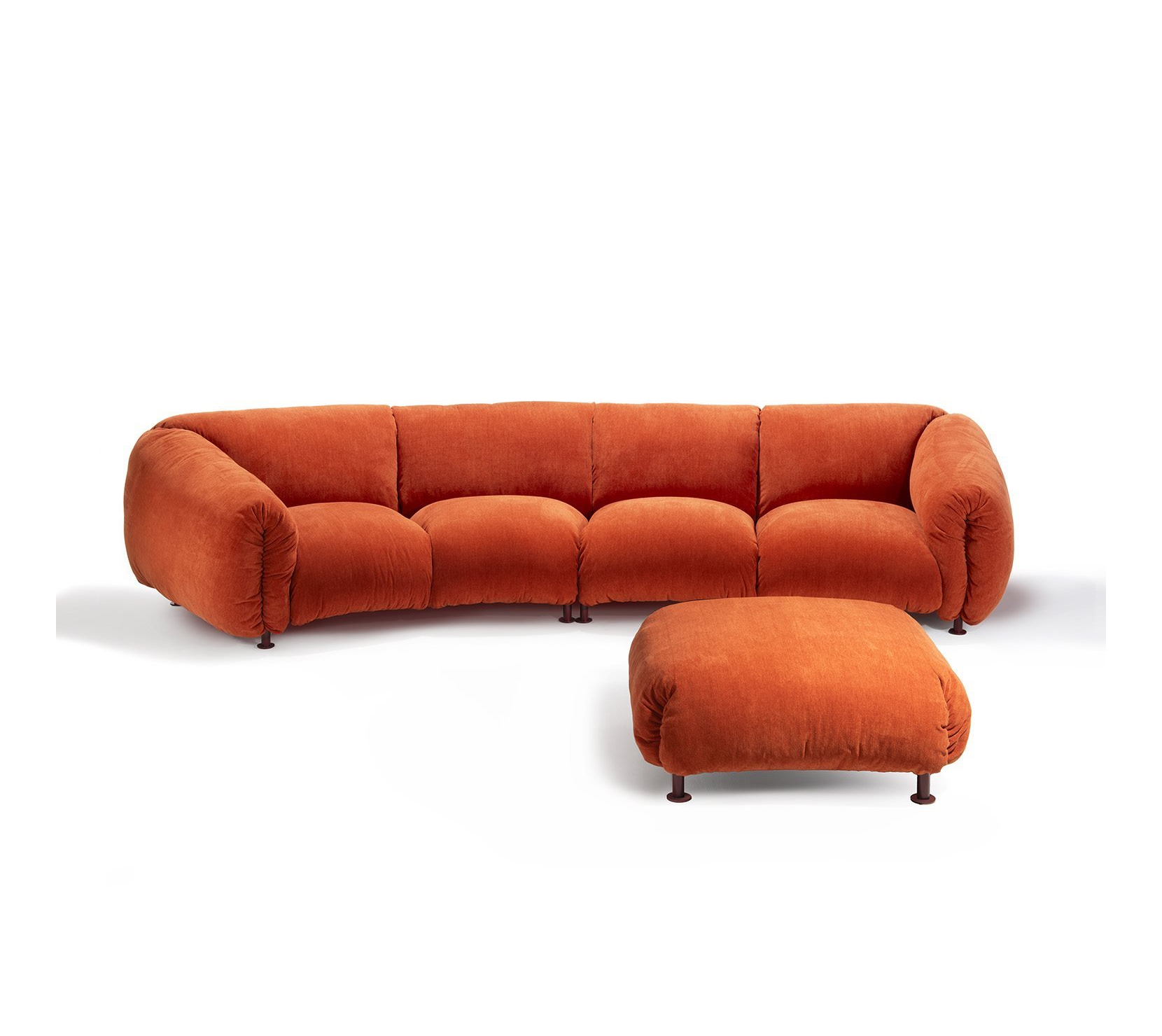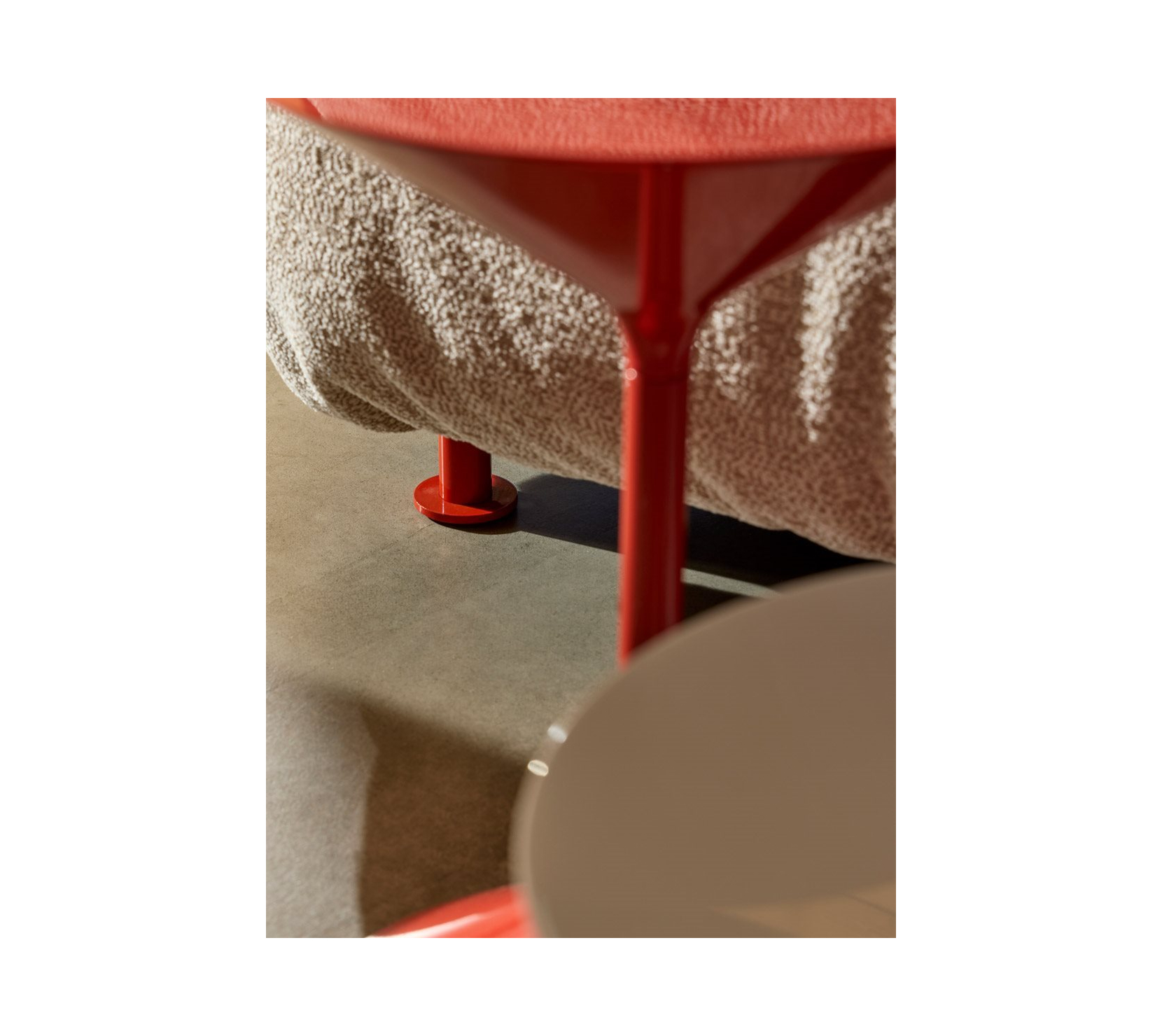 單體式模組沙發與腳凳。承重結構為鋼材,塗裝顏色選擇包括 talc、hemp、orange、amaranth、grass green、espresso 與 black,搭配同色系 stiff polyester 織帶(色號 anthracite)支撐坐墊。坐墊、背墊與扶手填充物為聚氨酯與可再生聚酯纖維球,黏合過程不使用膠水。外層布套可拆卸清洗。