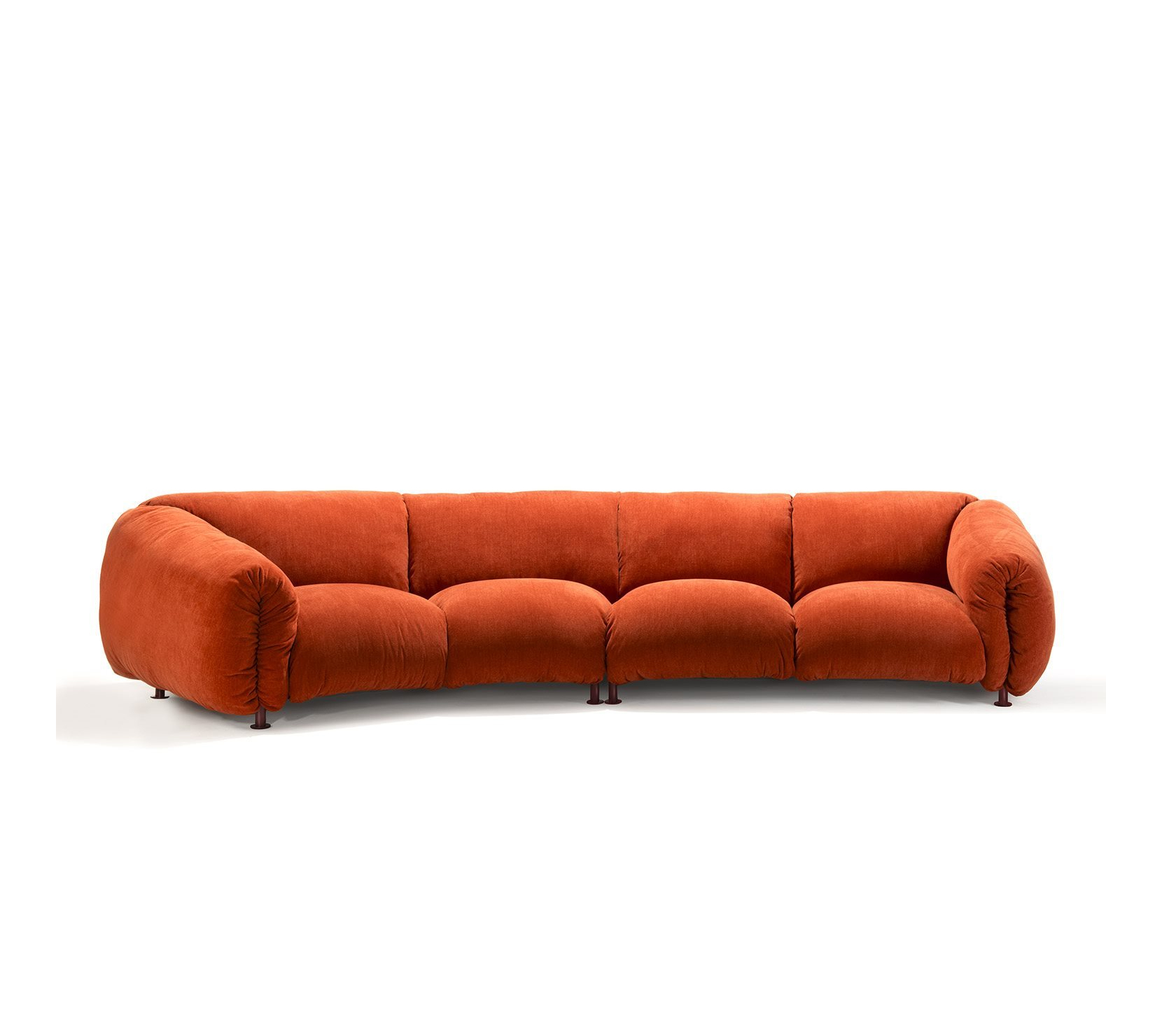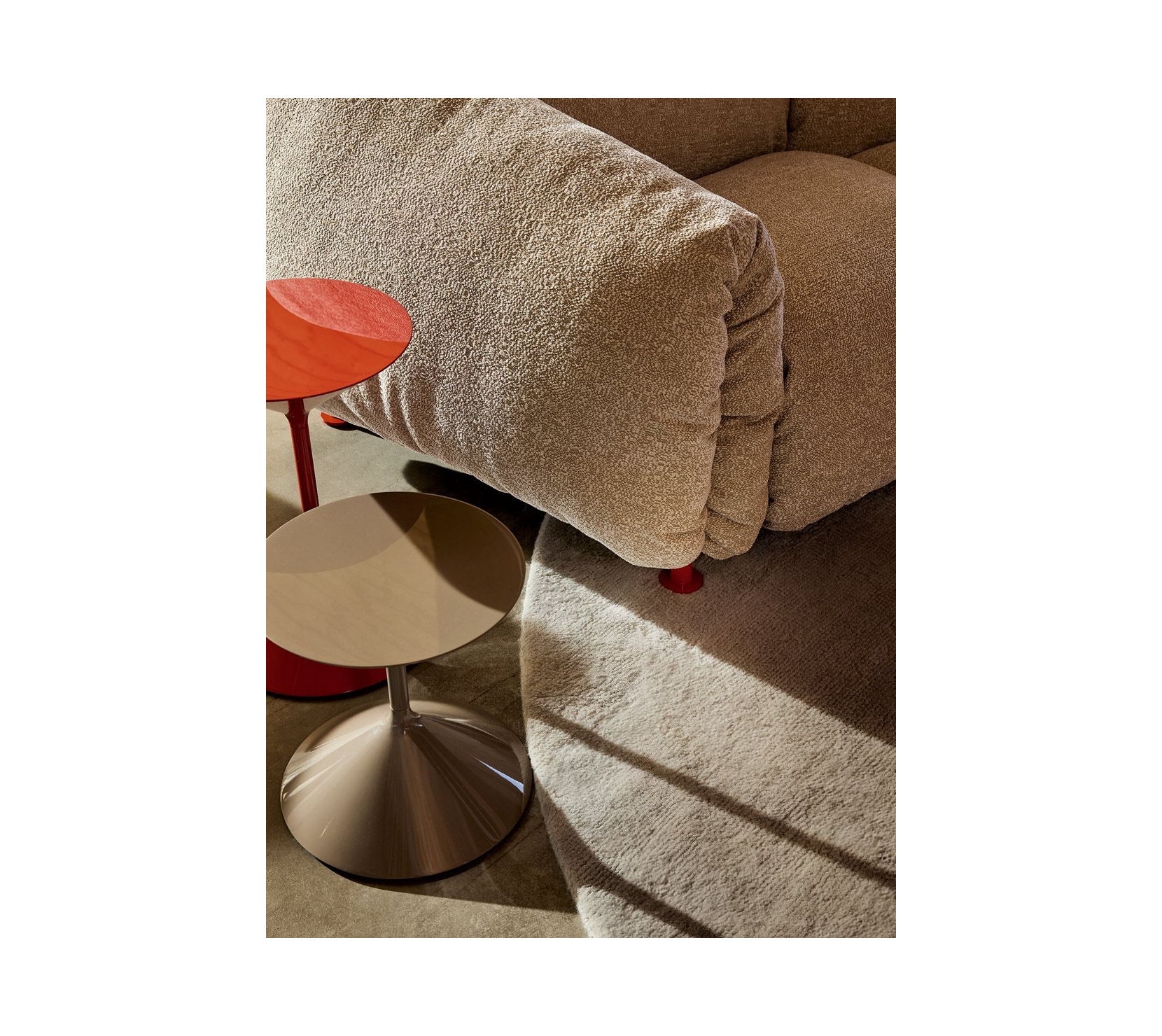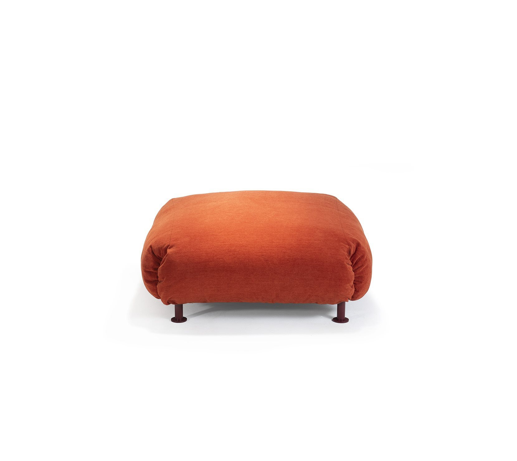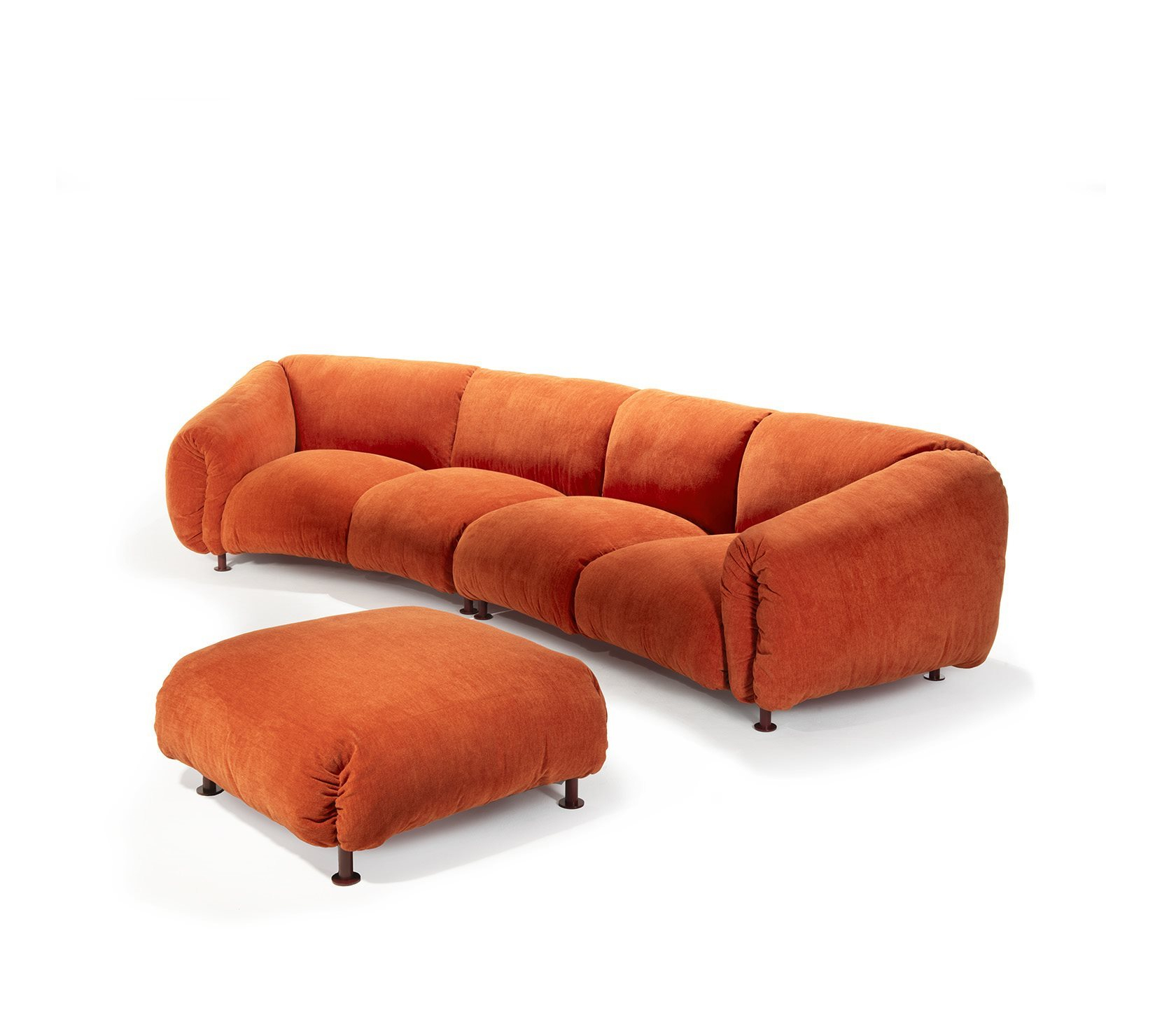 單體式模組沙發與腳凳。承重結構為鋼材,塗裝顏色選擇包括 talc、hemp、orange、amaranth、grass green、espresso 與 black,搭配同色系 stiff polyester 織帶(色號 anthracite)支撐坐墊。坐墊、背墊與扶手填充物為聚氨酯與可再生聚酯纖維球,黏合過程不使用膠水。外層布套可拆卸清洗。